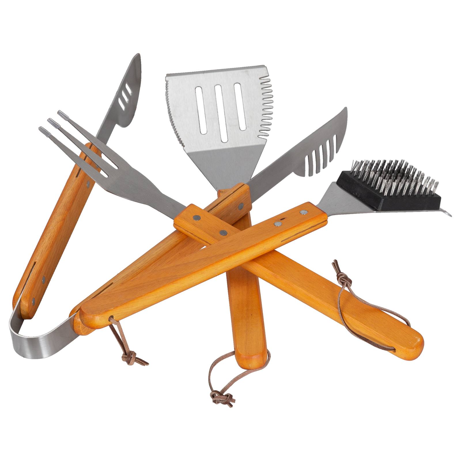 This 4-piece set has everything you need to create delicious grilled food. Made from high-quality stainless steel with bamboo handles, this set includes a fork, spatula, scraper and tongs for all your grilling needs. From meat to vegetables, this kit has what you need!