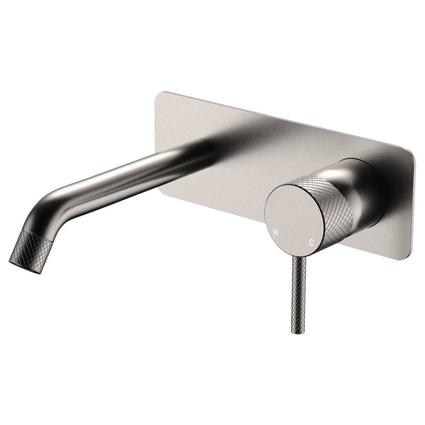 Unique industrial cross-hatched handle and spout Designed for basin and bath PVD brushed nickel finish Free flow aerator included for bath installation Made from solid brass High quality European cartridge (35mm) Please note, these products may have a visible Fienza or Watermark logo.