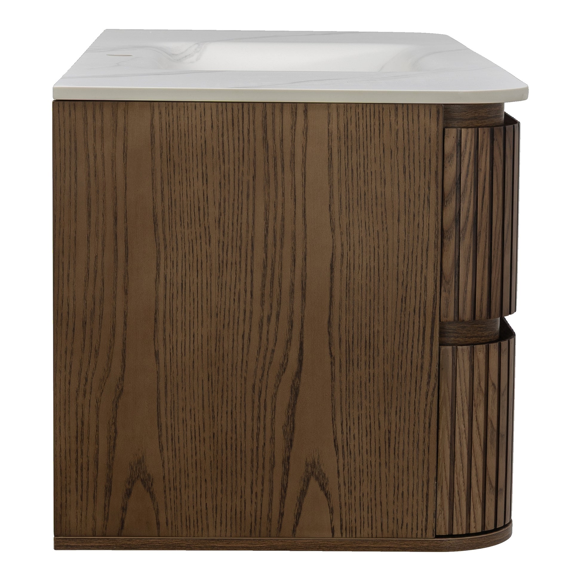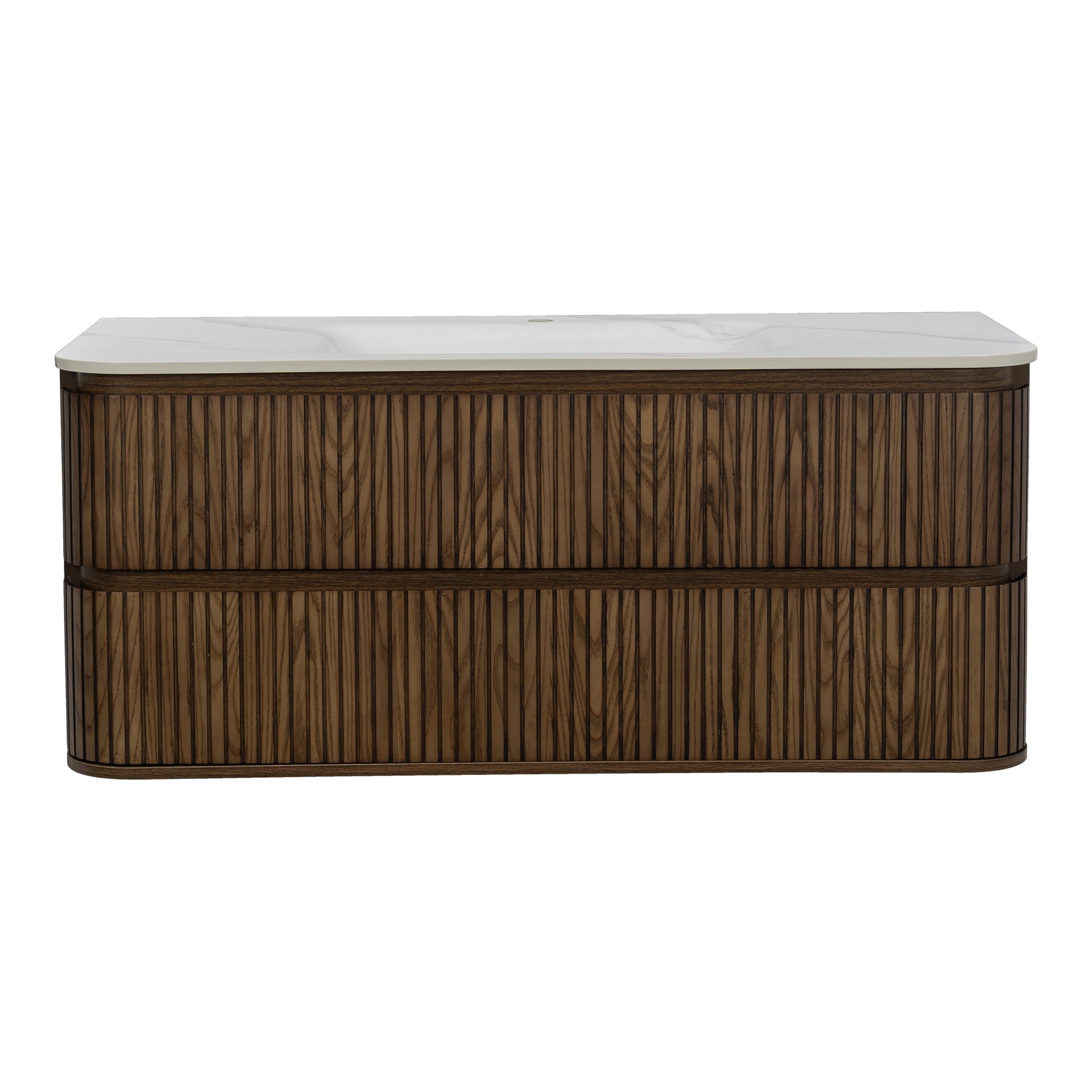 The Calso 120cm Wall Hung Single Vanity is designed for those needing style and extra storage in larger bathrooms, available in Light Tan and Dark Walnut. With a seamlessly integrated basin and a white sintered stone top featuring a subtle grey vein marble finish, this vanity exudes sophistication. The timber slats add warmth and texture, while hidden handles and soft-closing drawers ensure a sleek, modern look. Its space-maximising wall-hung structure provides generous storage capacity while maintaining a clean, clutter-free floor space, making it easy to maintain and keep your bathroom organised.
