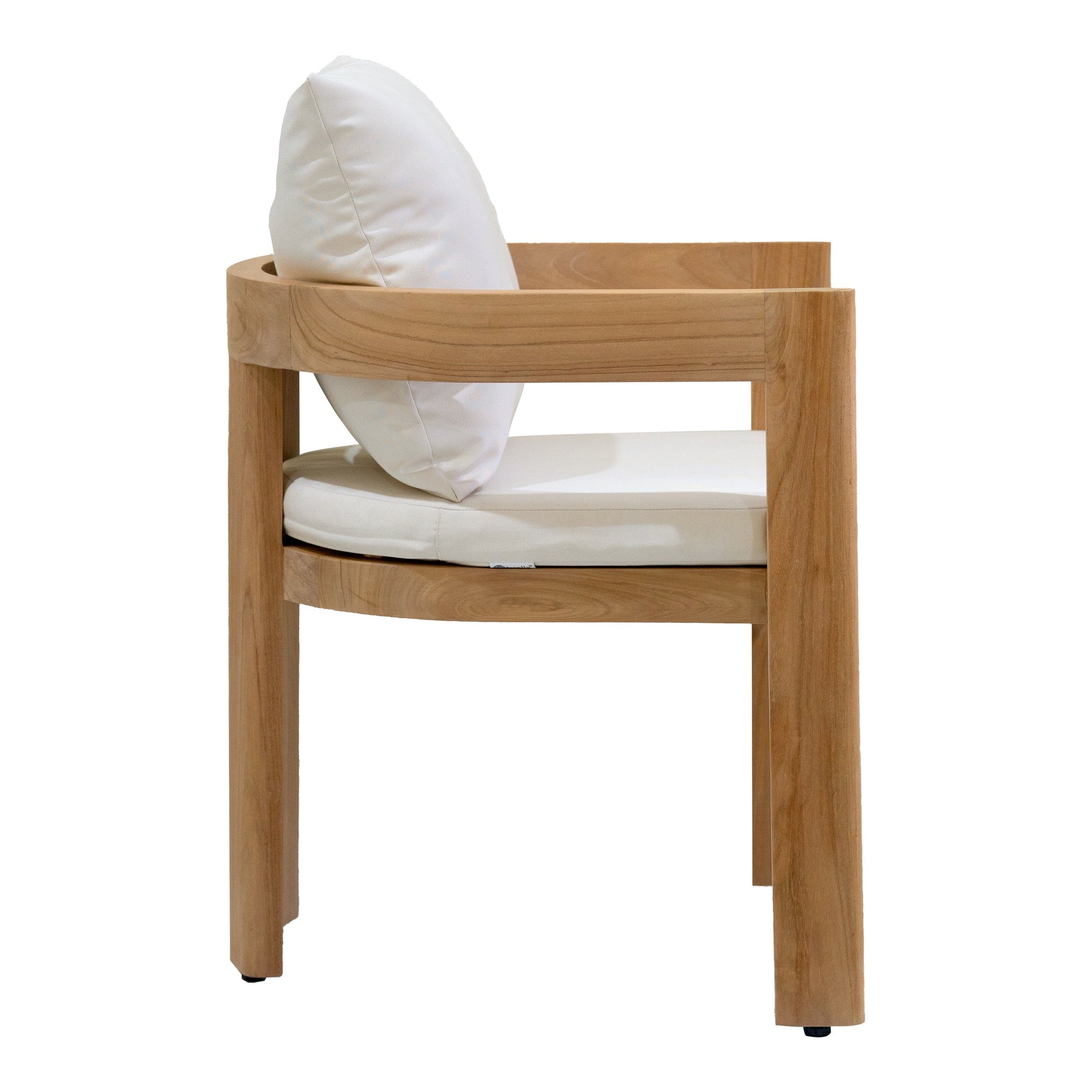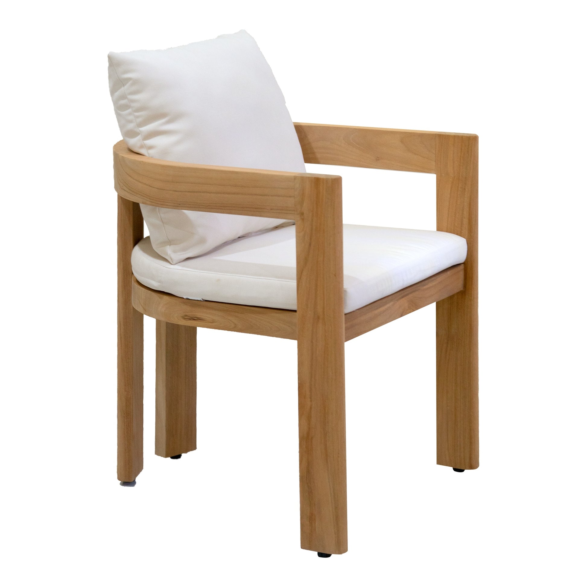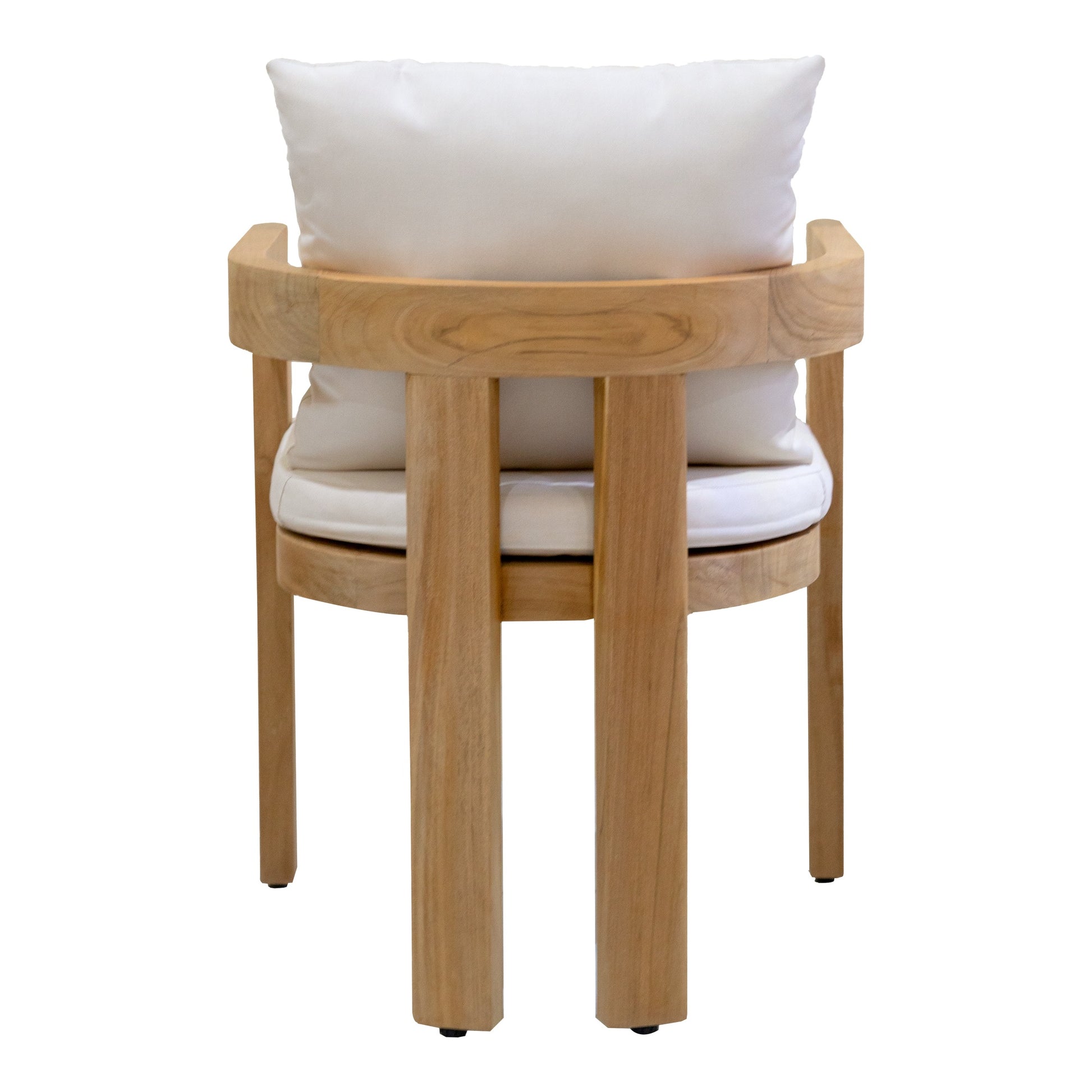 Substantial presence with refined proportions. Wide, generous build offers the kind of substance you'd expect from an armchair, designed for long dinners where no one's in a hurry to leave. Clean-lined FSC-certified Grade A teak frame with traditional mortise-and-tenon joinery—built with the same precision as fine indoor furniture. Sunbrella cushions in soft beige canvas maintain their shape season after season. Softened edges and architectural proportions elevate this beyond typical outdoor dining. Natural teak weathers gracefully to silvery grey, while weather-resistant cushions hold their form and colour through years of outdoor use. The kind of chair you choose once and use for decades.