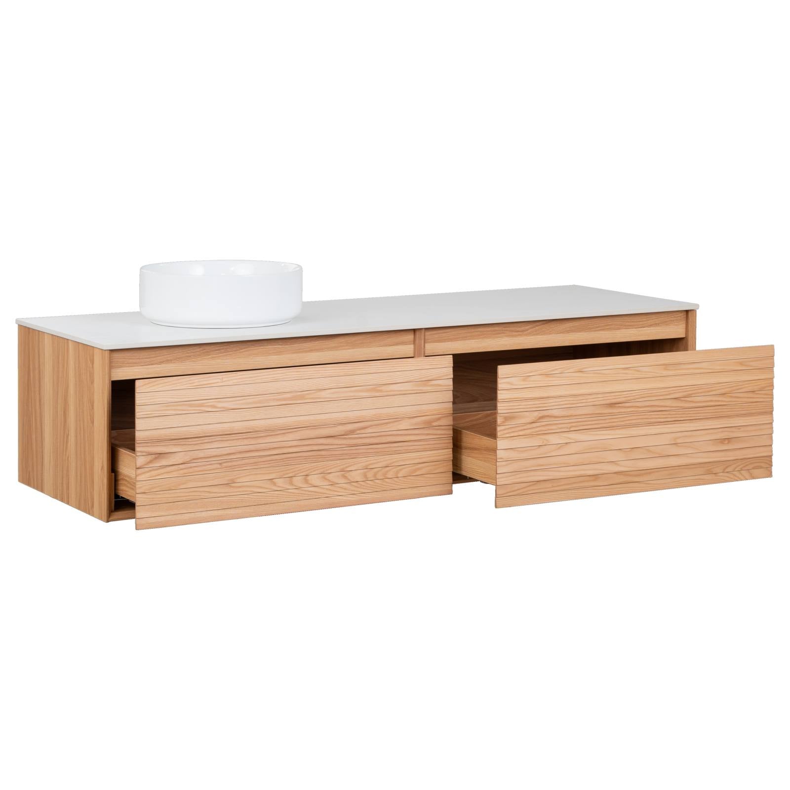 The Donna 150 single wall-hung vanity features a sleek, contemporary design with extensive storage and counter space, making it a perfect choice for larger bathrooms. It is constructed with a durable melamine frame and elegant timber veneer drawer fronts and showcases a stylish light ash finish. The white sintered stone countertop offers exceptional durability with stain and scratch resistance. Soft-close, full-extension drawer runners and discreet pull channels ensure effortless functionality while maximising storage. Thoughtfully designed, it arrives pre-drilled for an easy countertop basin setup and seamless waste installation. It can be a reversible top compatible with the left or right side basin configuration.