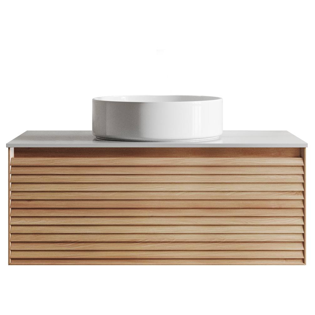 The Donna 90 single wall-hung vanity features a space-saving design with a sleek, modern aesthetic, perfect for contemporary bathrooms. Constructed with a durable melamine frame and elegant timber veneer drawer fronts, it showcases a stylish light ash finish. The white sintered stone countertop offers exceptional durability with stain and scratch resistance. Soft-close, full-extension drawer runners and discreet pull channels ensure effortless functionality while maximising storage. Thoughtfully designed, it arrives pre-drilled for an easy countertop basin setup and seamless waste installation.