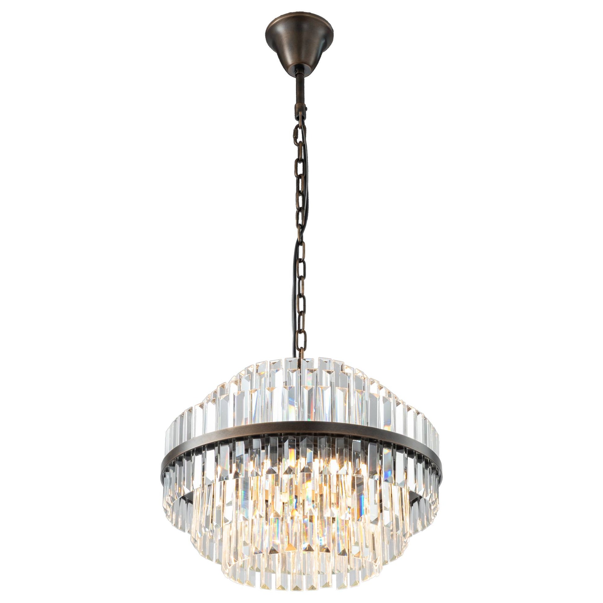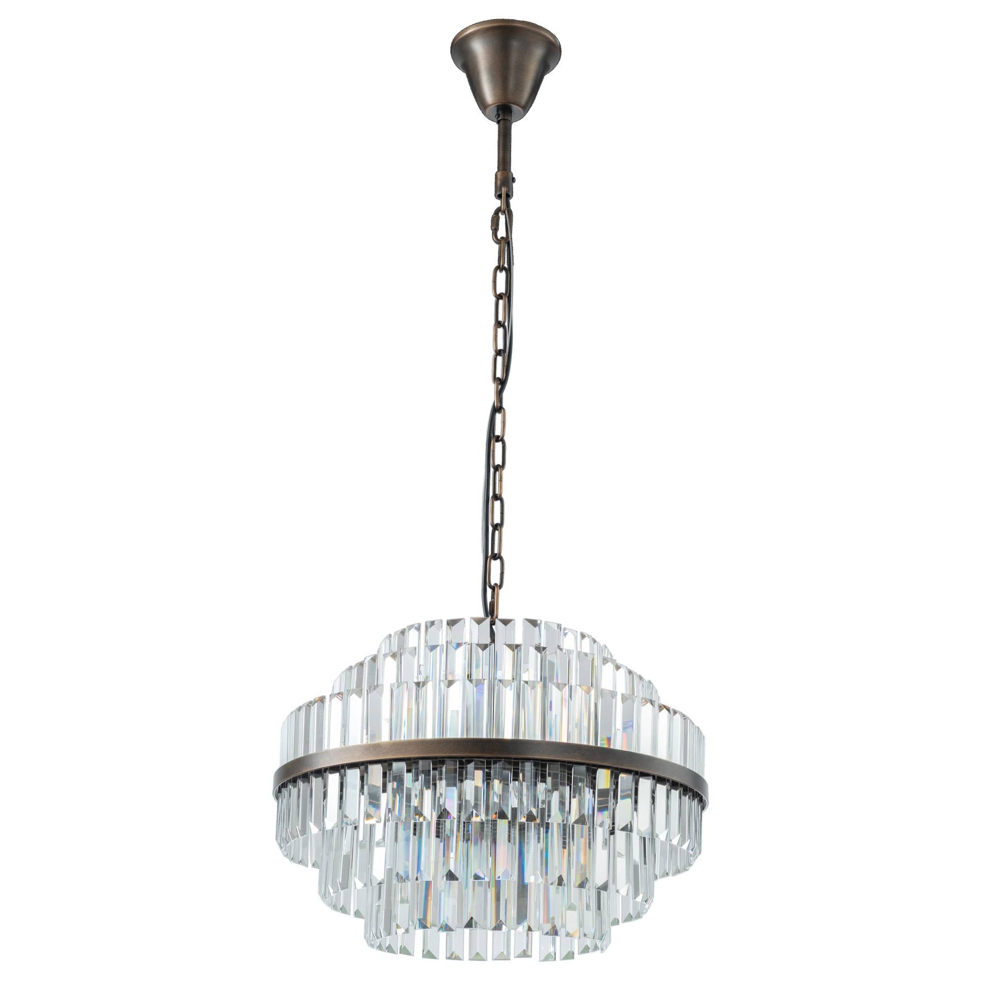 Elegant and eye-catching, the Evelyn 50cm Chandelier Antique Brass range brings a touch of modern glamour to any interior. Available in two sizes and finished in a rich antique brass, each chandelier showcases a striking design adorned with faceted crystal prisms that beautifully catch and reflect the light.