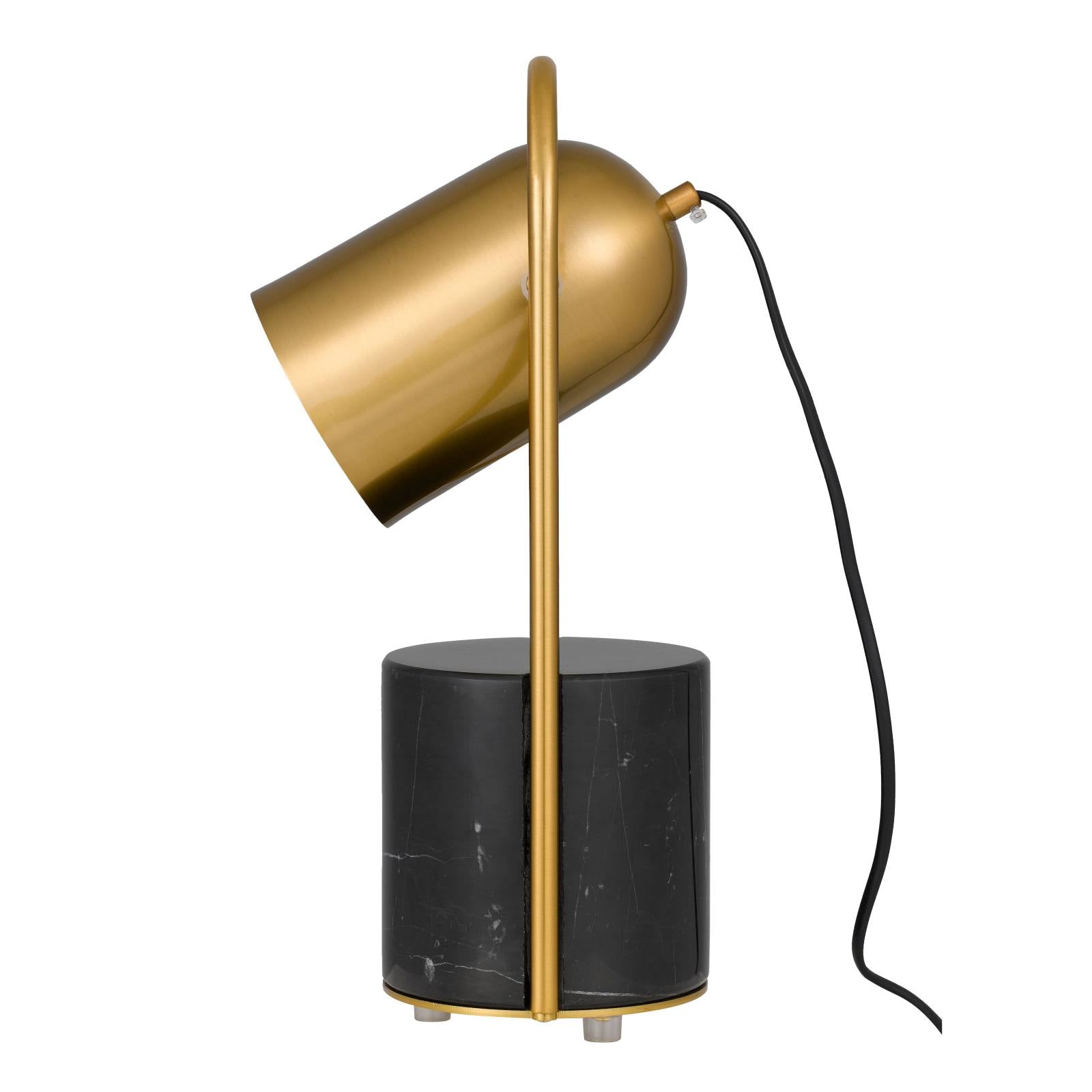 The FIDEL table lamp is the perfect accent direct light source. The marble base is saddle with a metal tube that allows the spun metal shade to pivot, directing light to your desired surface. The antique gold frame is contrasted with black or white marble.