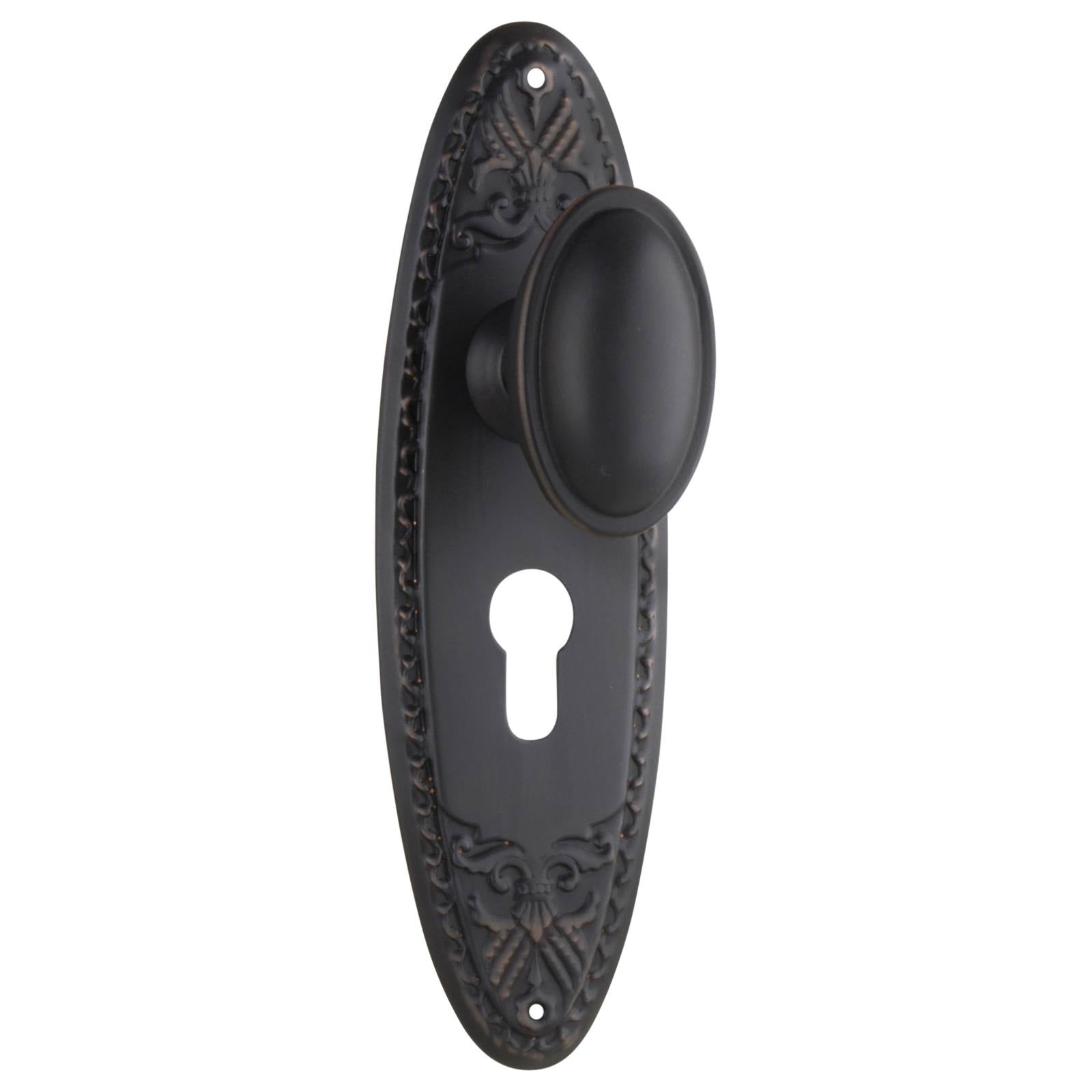 Euro door handle sets are designed for use on external doors where high-security is needed and a modern style key is desired. The backing plates will have a larger Euro-shaped keyhole cut-out that will fit the euro cylinder (C4 type). These handles require both the "Euro lock body" and the cylinder. The cylinder is available with keyholes on both side of the door, or a keyhole on the outside and a thumb turn on the inside.