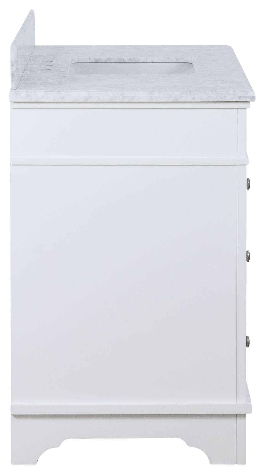 The vanity's marble splashback is a great addition that not only adds to its aesthetic appeal but also acts as a protective barrier between the vanity and the wall. The Fremont is a marvel of form and function, with high-quality dovetail construction soft-close drawers that are built to last, and soft-close doors that provide ample storage space inside the cabinet to help you keep your bathroom tidy and organized. In addition, the marble top is pre-sealed for added durability and protection, however, it's recommended that you clean up any spilt liquids immediately using a soft damp cloth. The vanity also features adjustable feet, which allows you to customize its height to align perfectly with your wall tiles. A great match with this piece is our rectangular basins with overflow protection that perfectly complement the vanity's elegant lines.