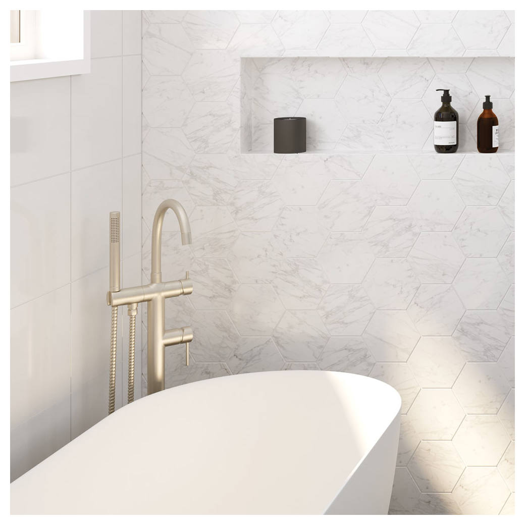 Kaya Floor Mounted Bath Mixer With Hand Shower, Brushed Nickel