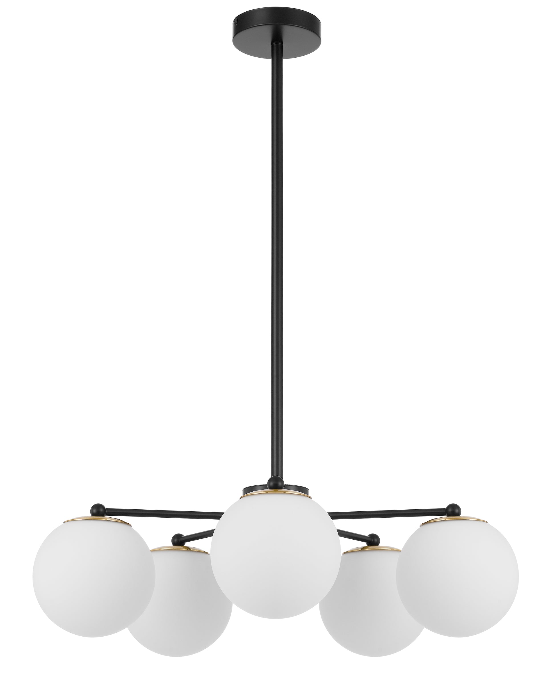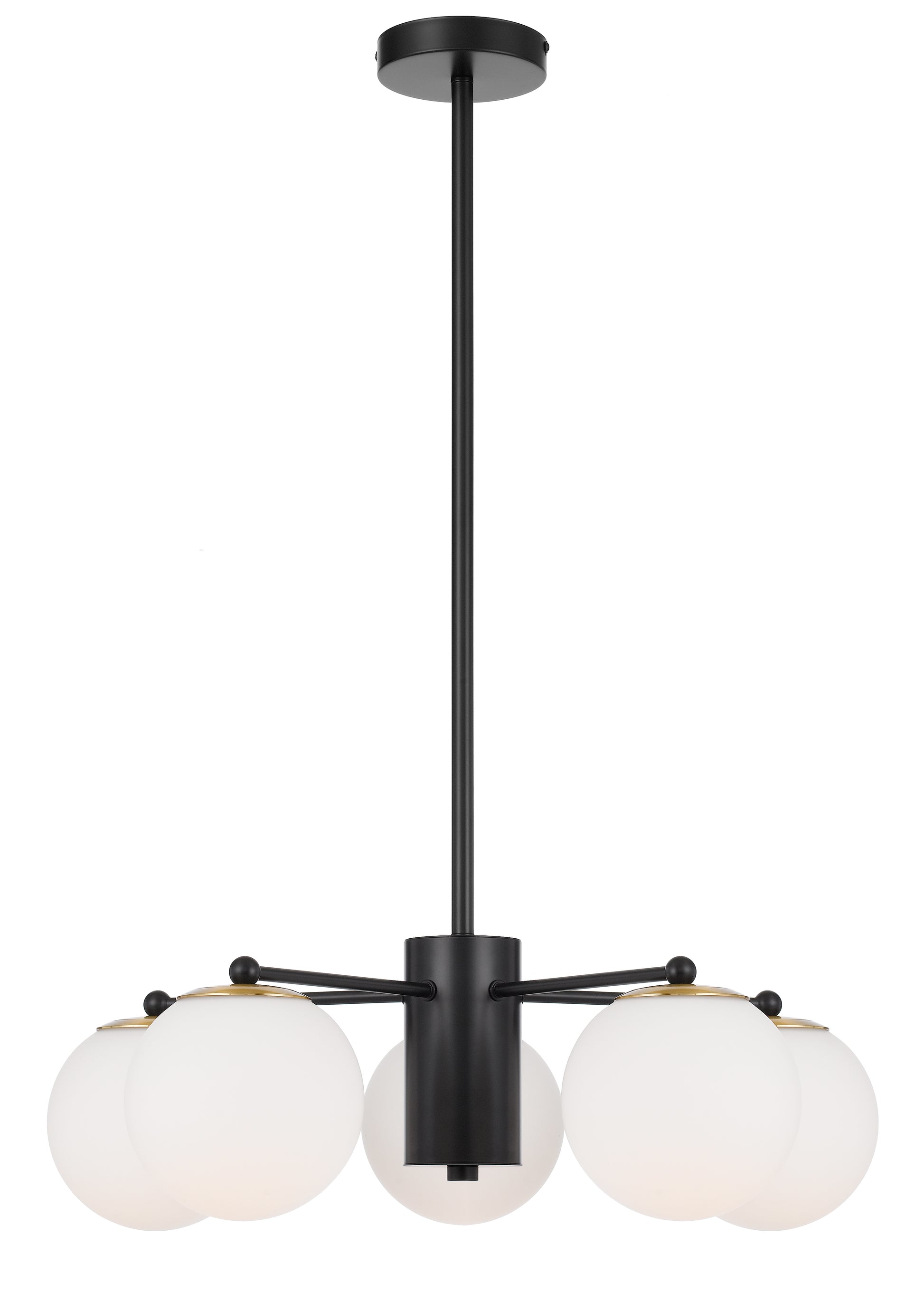 The MARSTEN 5 is a simple deco pendant that complements transitional to more contemporary styles. Five straight rods, each with their own glass sphere give a robust, yet compact effect giving the fixture a unique character. Available in Antique gold or black.