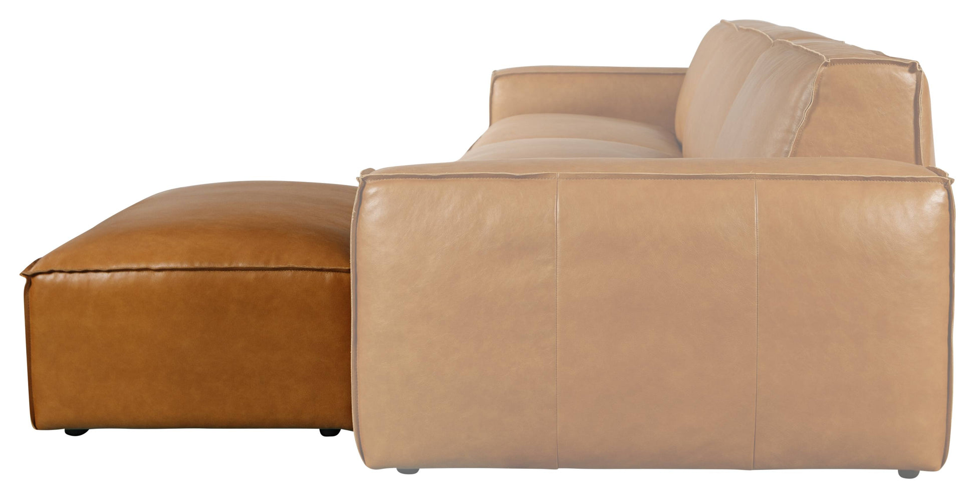The Nola Leather Ottoman in como tan combines style with flexibility. Upholstered in genuine top-grain cowhide leather, it develops a rich patina over time, adding unique character. The foam and feather-filled cushioning offers superior comfort, whether used as a footrest or extra seating. Clean lines, exposed seams, and a sturdy timber frame complete its modern, versatile appeal.