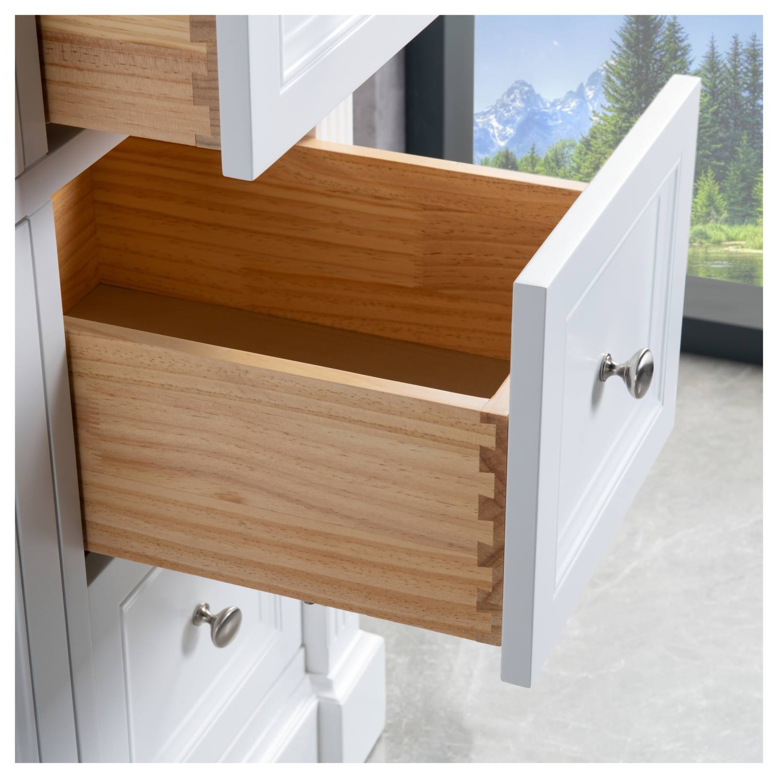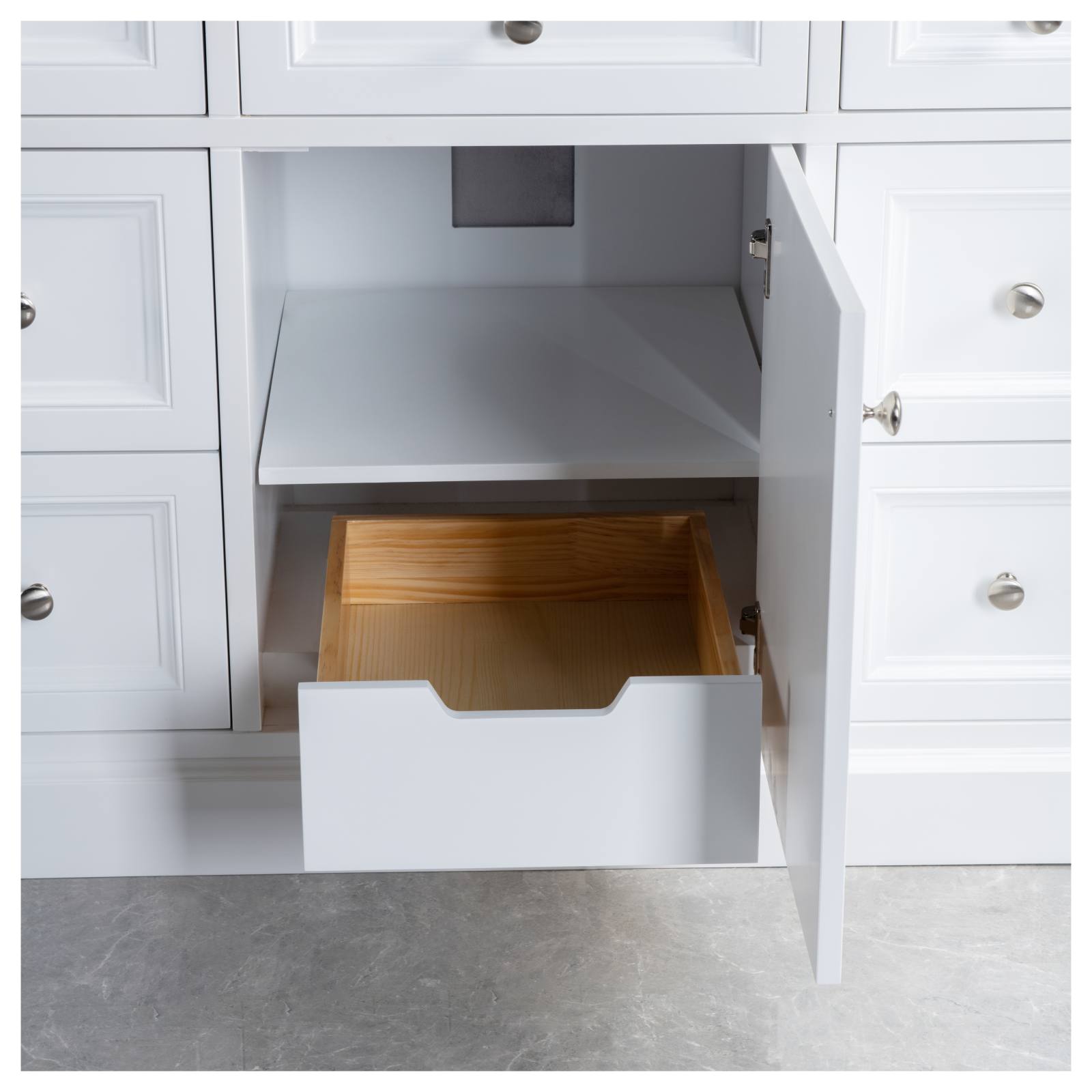 The vanity's marble splashback is a great addition that not only adds to its aesthetic appeal but also acts as a protective barrier between the vanity and the wall. The Classique is a marvel of form and function, with high-quality dovetail construction soft-close drawers that are built to last, and soft-close doors that provide ample storage space inside the cabinet to help you keep your bathroom tidy and organized. In addition, the marble top is pre-sealed for added durability and protection, however, it's recommended that you clean up any spilt liquids immediately using a soft damp cloth. The vanity also features adjustable feet, which allows you to customize its height to align perfectly with your wall tiles. A great match with this piece is our rectangular basins with overflow protection that perfectly complement the vanity's elegant lines.