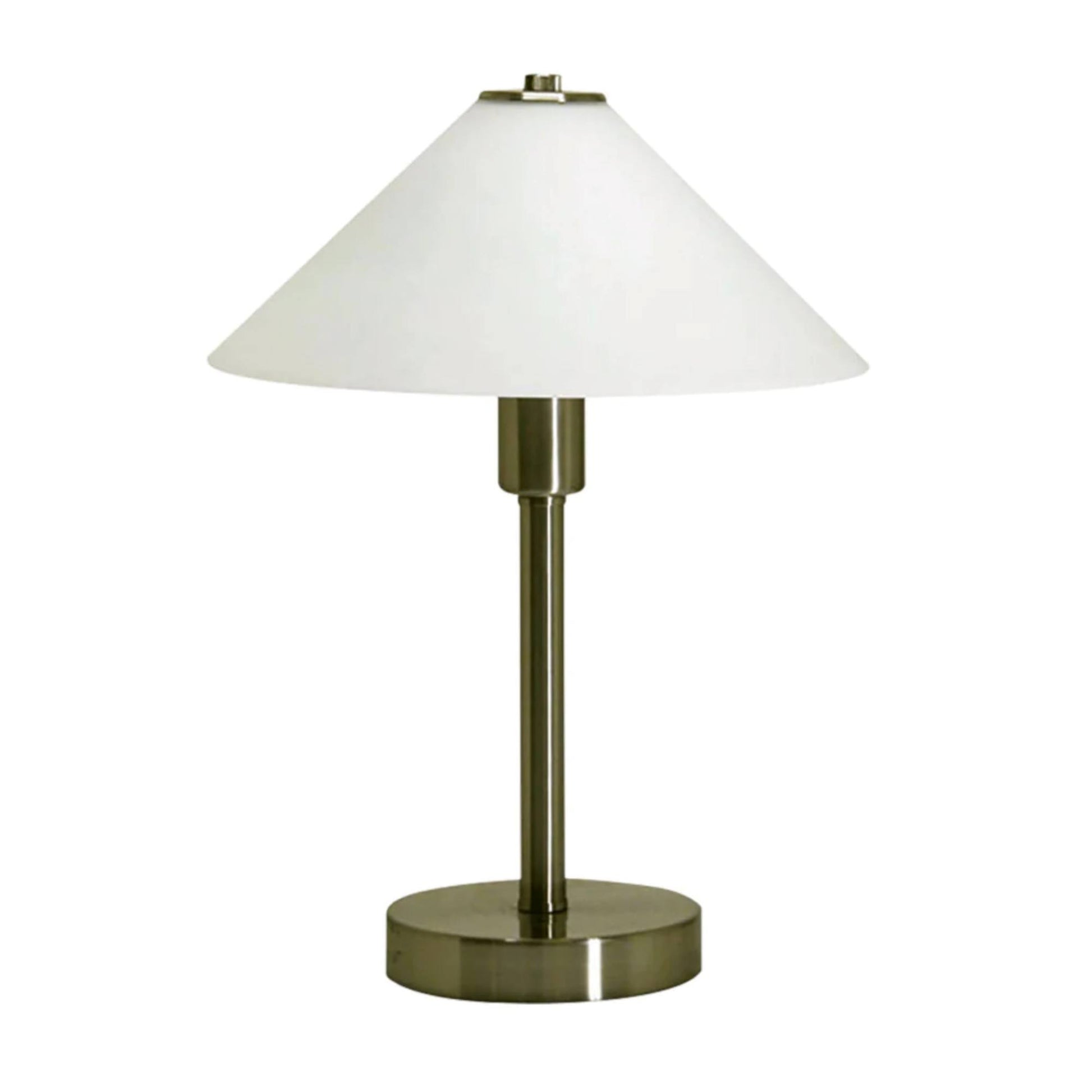 The Ohio contemporary design table lamp features a coolie shaped white glass shade, fixed to a slender brushed metal base. Touch anywhere on the metal base to turn on or off. Available in either antique brass, black or nickel base.