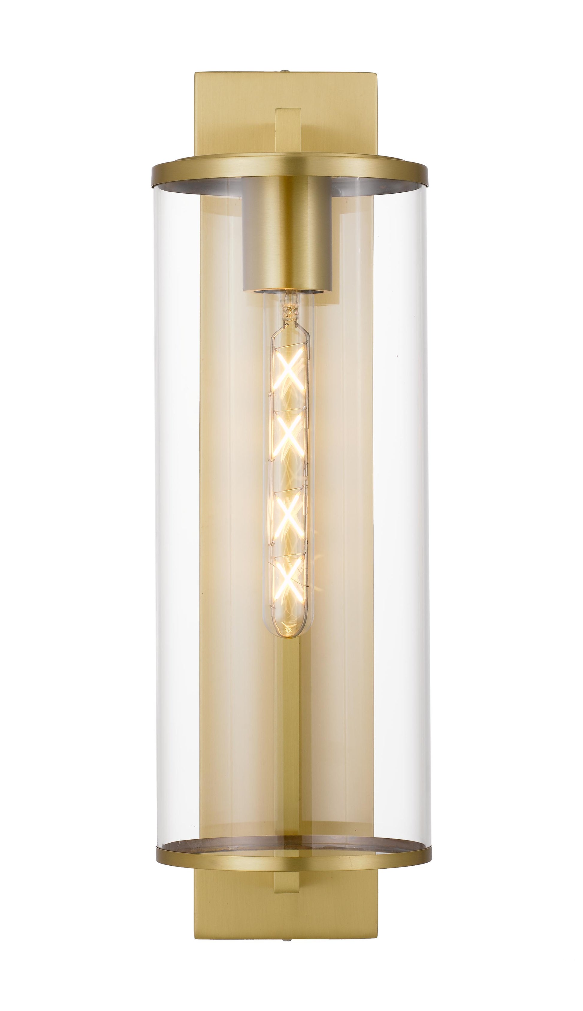 The Perova outdoor wall lamp is inspired by the best of minimalist design and is comfortable in any décor. This fixture is framed in solid brass with a tall cylinder. Add a vintage filament style bulb for an industrial look. It features a clear glass cylinder shade to add a rounded touch to this sleek and stylish fixture. Available in 2 sizes as either brass or black.