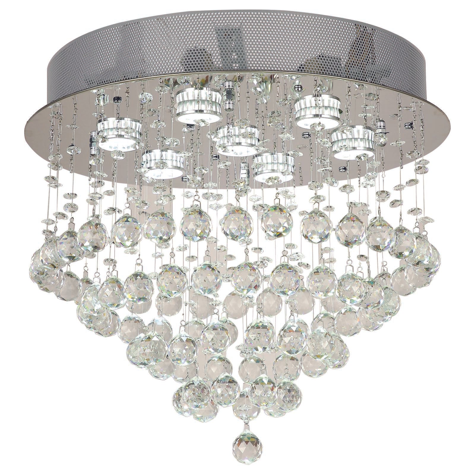 The SAVINA Round crystal collection makes a spectacular statement with lavish crystals and glowing LED light. Dramatic baskets and leaf waterfalls of hand-polished crystal spheres with sparkling beads suspend from the ceiling, shimmering light through each strand. The fixture is pre-trimmed with the crystal strands of fixed lengths, mounted to a precision-cut stainless steel ceiling plate.