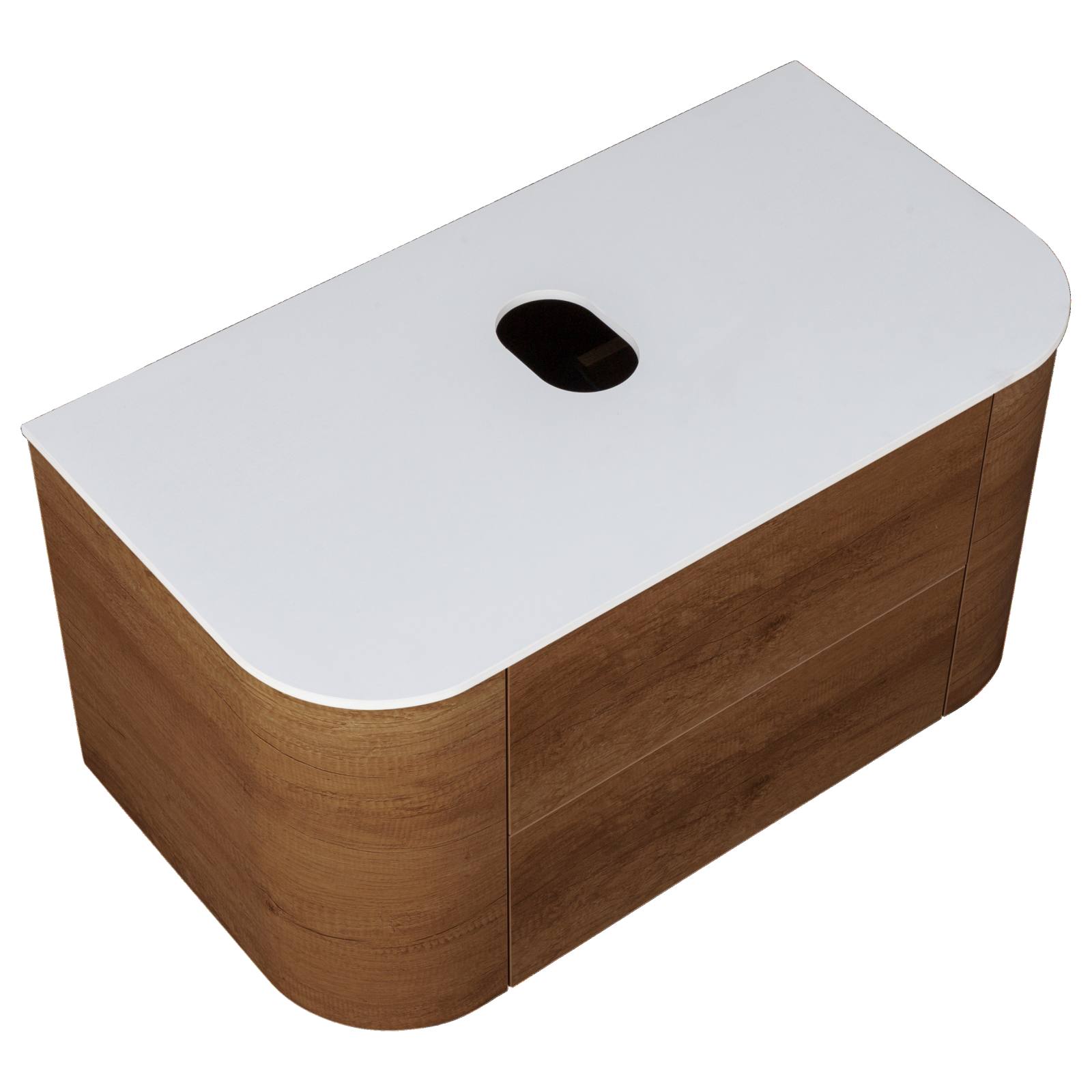 The Solara 90cm Single Wall Hung Vanity is designed to bring style and functionality to medium-sized bathrooms. Available in Sienna Tan and Dark Walnut finishes, it features a well-proportioned pure white sintered stone top, offering durability, extra storage, and counter space. With the option to add a benchtop basin, this vanity allows for customisation to suit your design preferences. The melamine finish, curved corners, and push-to-open drawers ensure practicality and a sleek, minimalist look. This vanity combines modern aesthetics with added functionality and is ideal for pairing with wall-mounted taps.