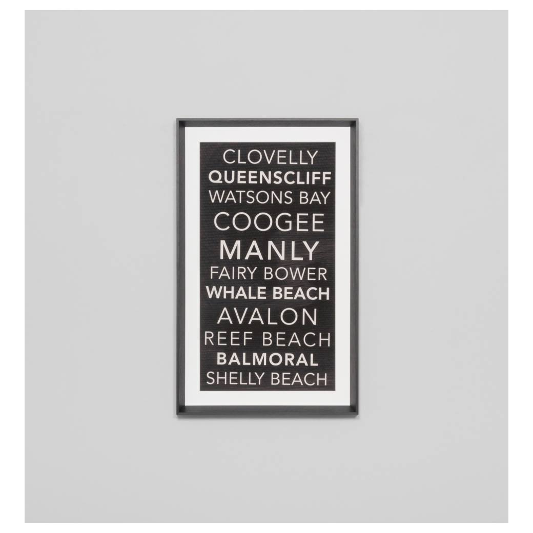 Sydney's beaches listed in this modern framed print. Please allow 3-6 weeks for production.