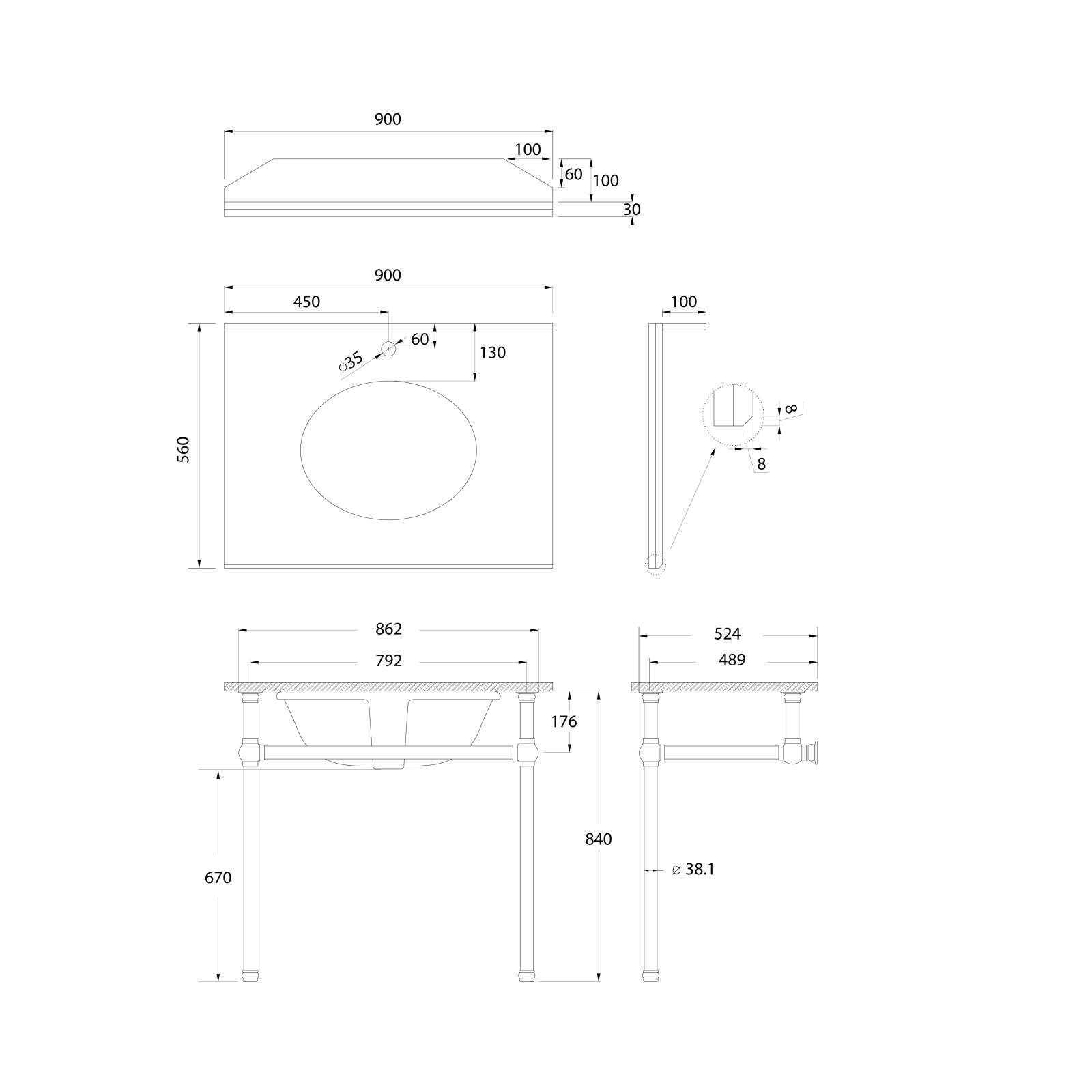 Turner Hastings Mayer Marble Top 90x55cm 3 Tap Hole Basin Stand, Brushed Nickel