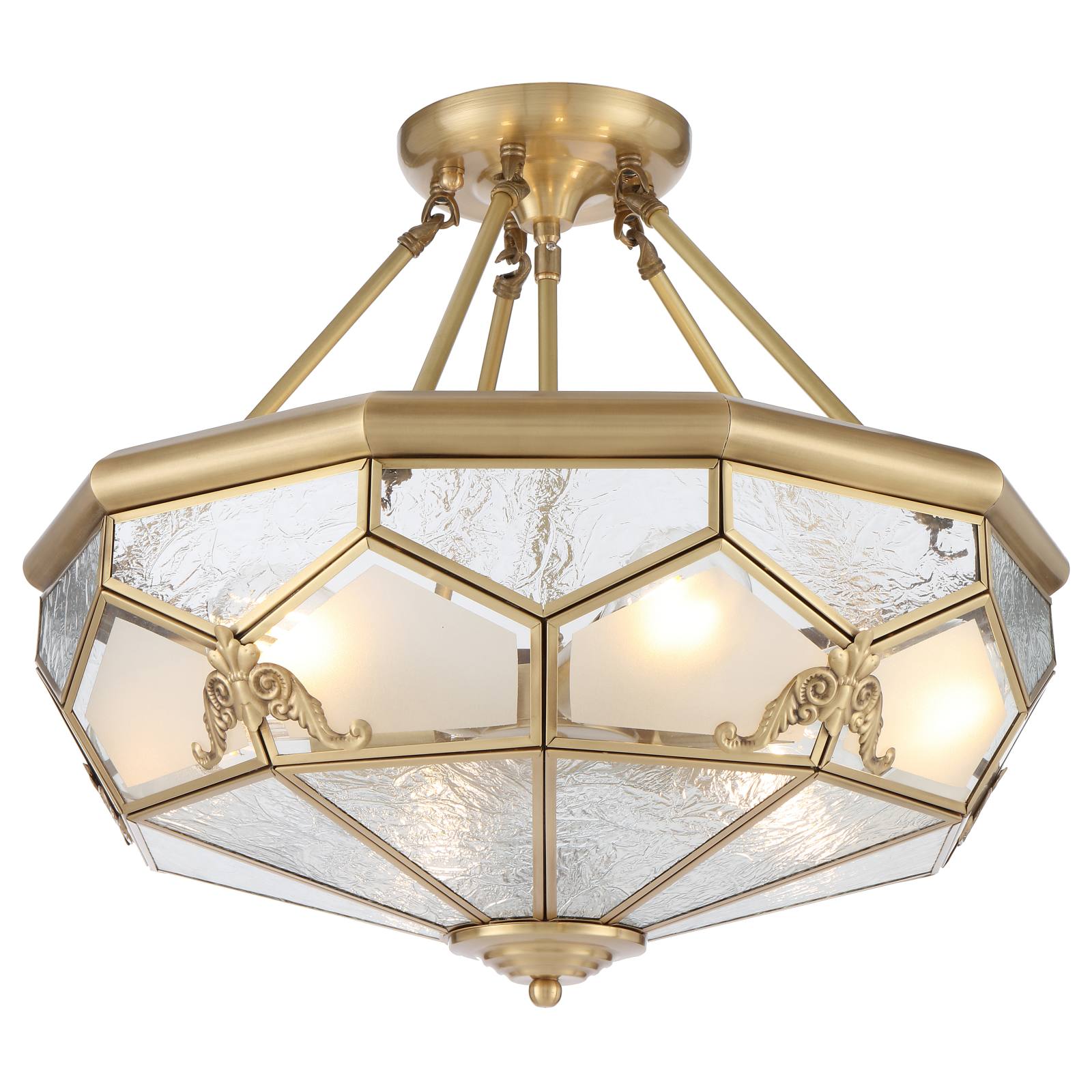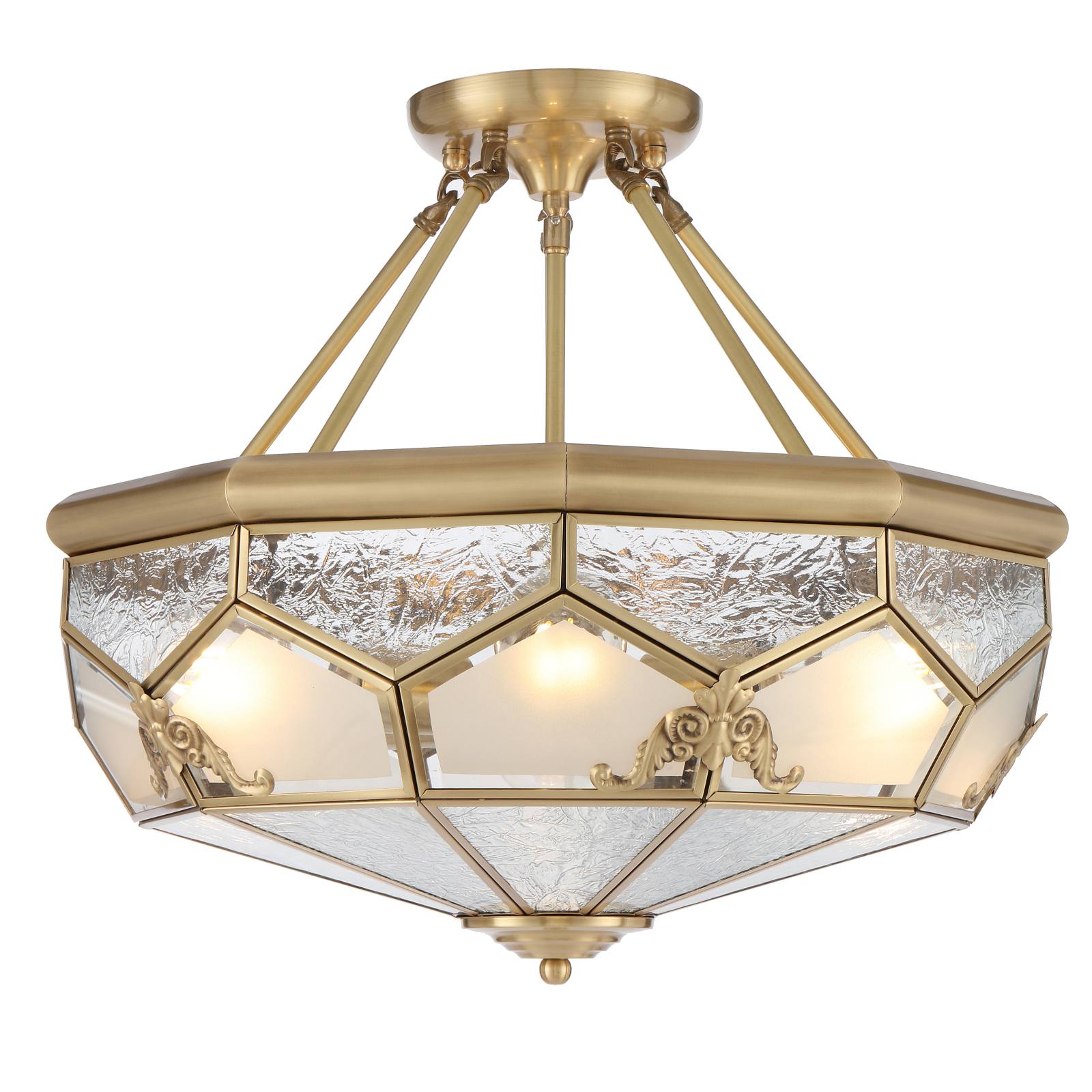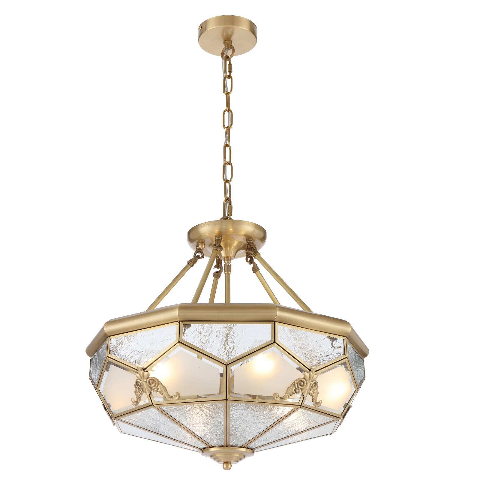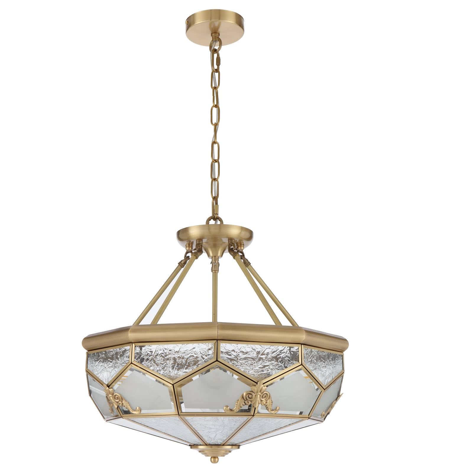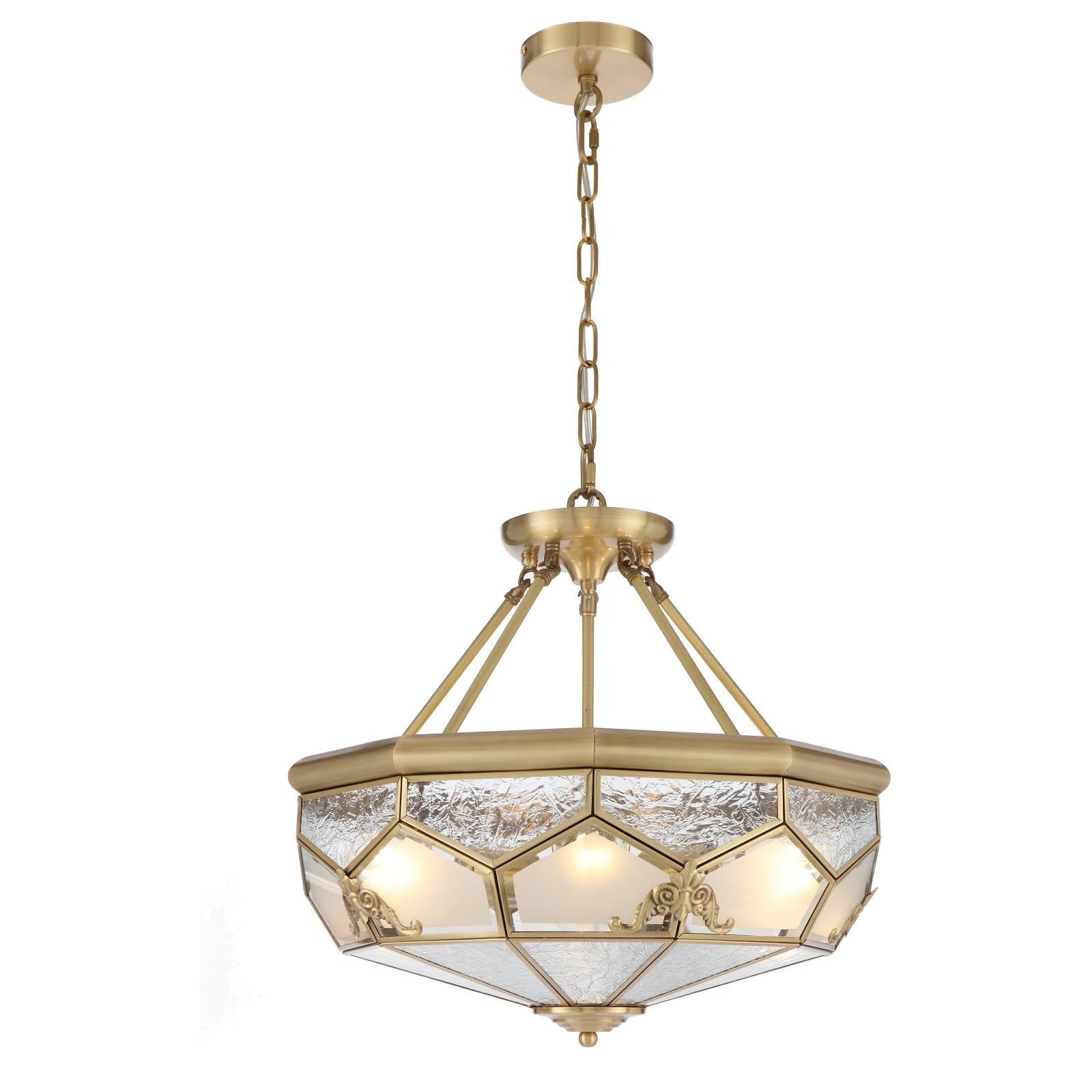 The Valmont Artisan Brass Pendant Light is a true masterpiece of design. Its composition elegantly marries clear water glass and acid frost glass panels, creating a harmonious play of light and texture. This captivating fixture is adorned with hand-pressed brass emblems, adding a touch of bespoke craftsmanship to its already exquisite design. Illuminate your space with the enchanting allure of the Valmont pendant. Can be mounted close to ceiling.