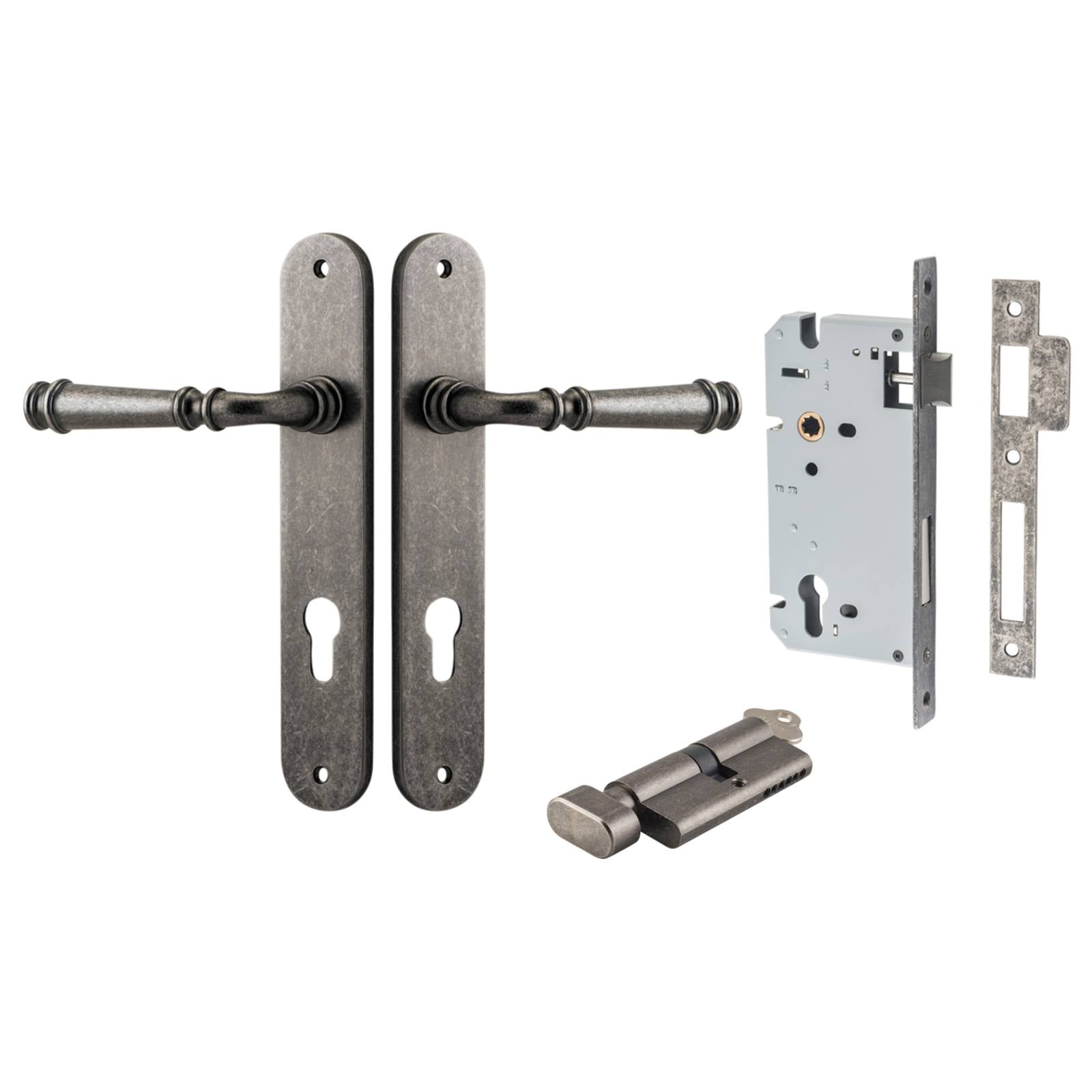 Verona Lever Oval Backplate Entrance Kit w High Security Lock Distressed Nickel